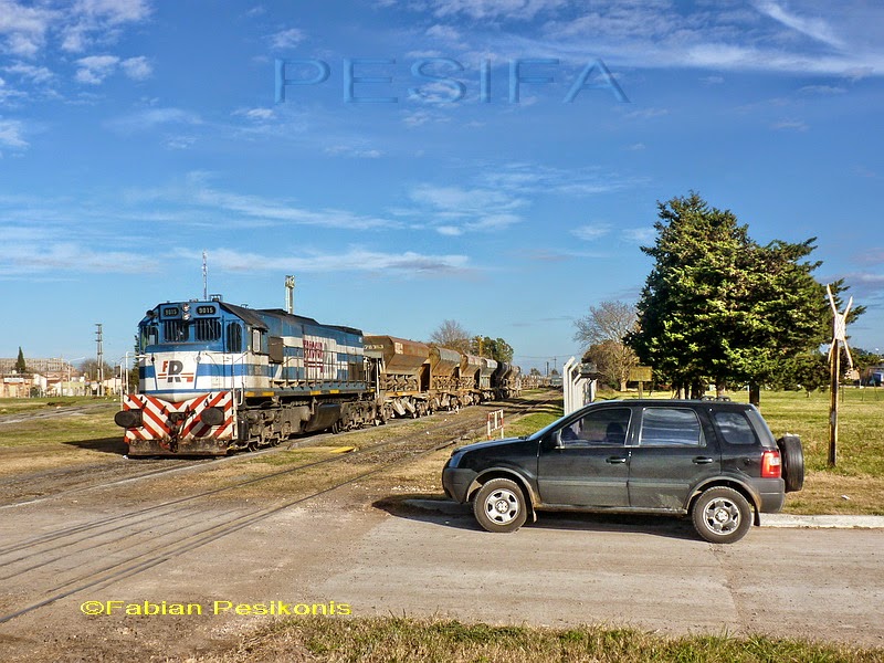 Trenes de Ferrosur Roca, en estacion Hinojo. El primero, con la EMD GT22 9015, armando tren pedrero y partiendo en direccion a Buenos Aires. El segundo con la EMD GT22 9011, bajando de la cantera y acomodando vagones en la estacion. Fotografias 21Jun14.