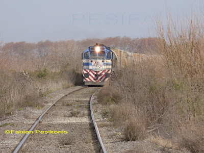 Cruzada de trenes en estacion Zenon V Dorna: uno que se va, y no pude ver la locomotora, atras la GE 2000 con vacios de cemento; cruzan a la GT22 9003.