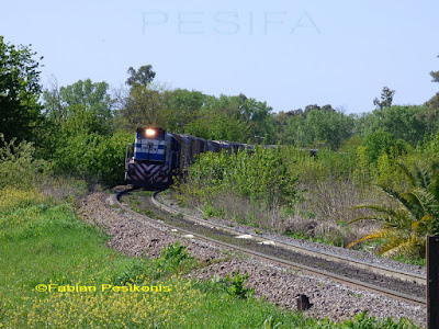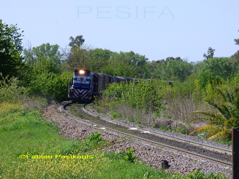 Las Flores: GT22 9010 ingresando desde el norte. GT22 9061, detenida en estacion.